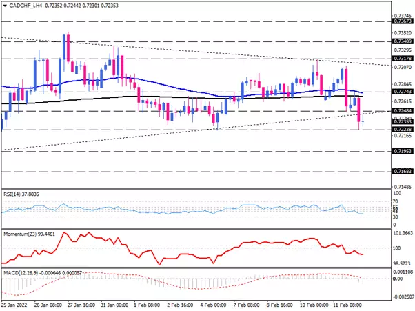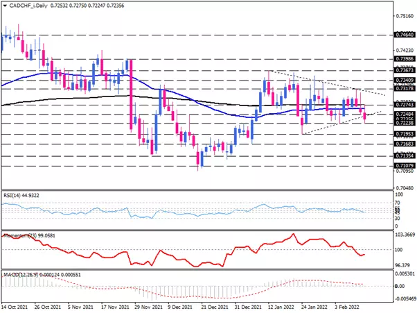 The daily chart shows that the CAD/CHF has consolidated in a triangle pattern. However, sellers have seized control of the pair, pushing its price under its 200-day exponential moving average to penetrate the lower edge of the pattern.