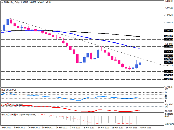 Euro on the daily chart, started the week strengthening against the Australian dollar, as buyers cut further losses around the 5-year low and bottomed at 1.45338, putting the pair on its third consecutive rising day. This is a sign of fading bearish momentum, which can keep buyers hopeful for a bullish reversal.